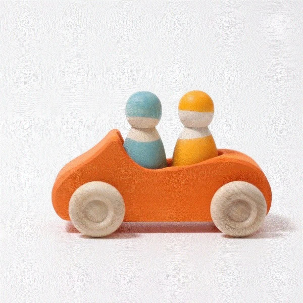 Bitte einsteigen für eine kleine Spritztour im orangenen Cabrio. In dem großen Holzcabrio ist Platz für zwei kleine Holzfigur und schon kann es losgehen. Ob drin oder draußen, das Auto ist geländegängig und ein super Spielgefährte. Und wenn die Straßen doch etwas dreckiger waren als gedacht, kann man das Cabrio einfach mit einem feuchten Lappen reinigen.