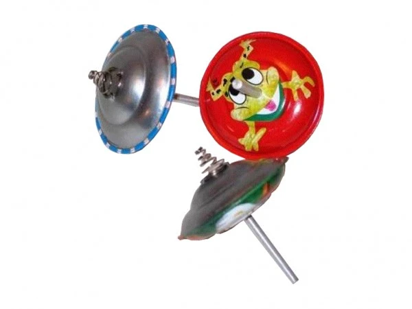 Hier muß etwas geübt werden. Der Kreisel wird mit Schwung zwischen den Fingern angedreht und entweder geworfen oder einfach fallen gelassen. Dann hüpft und kreiselt er munter vor sich hin!