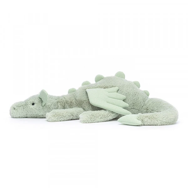 Wir lieben bei Fips die tollen superweichen Drachen von Jellycat! Hier der große Sage Dragon in Salbeigrün – wer hat sich diese Farbbezeichnung wieder ausgedacht? Er hat einen ganz sanften freundlichen Gesichtsausdruck, Flügel, Zacken auf dem Rücken, ein magisches Kerlchen. • Maße 66cm x 16cm • Handwäsche • Geeignet ab Geburt, aber wegen der Größe nicht unbeaufsichtigt im Bettchen belassen