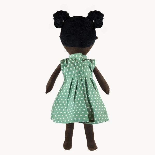 Anna ist eine freundliche Kinderpuppe in grün-weiß gepunktetem Kleid. Das Kleid lässt sich durch einen Schlitz im Rückenteil einfach an und ausziehen. Der Puppenkörper hat eine weiche Oberfläche. Die zwei Haarzöpfe sind besonders weich aus Samtjersey gefertigt.
