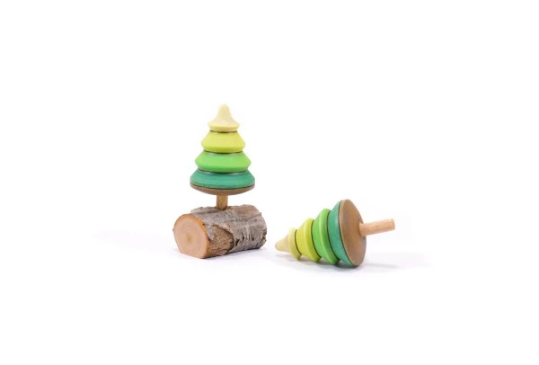 Der Baum ist ein beidseitig tanzender Kreisel für etwas geübtere Kreiselfans. Die Tannenspitze ist noch recht einfach angekreiselt, aber um den Baumkreisel auf dem Stamm drehen zu lassen ist schon kniffliger.