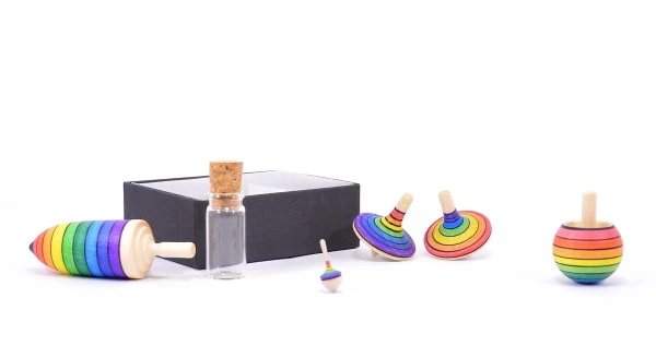 Mit dem Mader Kreisellernset Regenbogen finden Kinder einen tollen Einstieg in die kunterbunte Welt des Kreiselns. 5 Kreisel-Ausführungen in unterschiedlichen Formen und Größen sorgen für abwechslungsreiches Vergnügen und lange Zeiten voller Spielspaß. Die Kreisel verfügen über unterschiedliche Schwierigkeitsgrade, sodass die Jungs und Mädchen immer wieder kleine Erfolge feiern und Stück für Stück ihre Faszination für dieses tolle Hobby entdecken können. Die Mader Kreiselmanufaktur ist der Geheimtipp unter den Freundinnen und Freunden hochwertigen und vor allem handgedrechselten Holzspielzeugs. Viele Eltern schlagen in unserem Ladengeschäft immer wieder zu und freuen sich über die phantasievollen Ideen. Beste Naturmaterialien und individuelle Designs machen die Kreisel, Yoyos und viele weitere Artikel zu ganz besonderen Spielsachen, an denen Kinder langfristig viel Freude haben. • Mader Kreisellernset Regenbogen