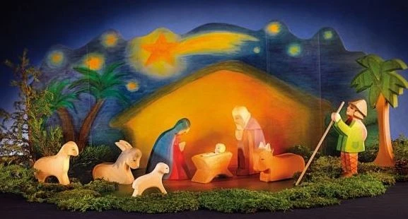 Hier ein elf-teiliges Set original Ostheimer Krippenfiguren mit einem Diorama (einem Hintergrund). Die Weihnachtsgeschichte kann mit den schönen Holzfiguren nachgespielt und erlebt werden.